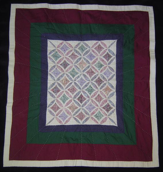 The center is my version of Cathedral Windows, with three borders machine stitched on and a backing applied.